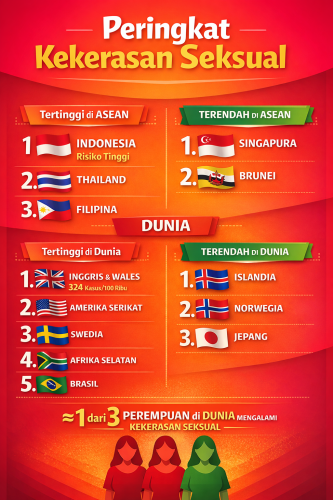 Di kawasan ASEAN, Indonesia sering muncul sebagai negara dengan risiko tinggi. Dalam perbandingan regional, Indonesia berada di posisi atas, diikuti oleh Thailand dan Filipina. Sementara itu, Singapura dan Brunei tercatat sebagai negara dengan tingkat yang relatif lebih rendah. Namun, penting dipahami bahwa angka rendah tidak selalu berarti aman. Dalam banyak kasus, rendahnya angka justru berkaitan dengan minimnya pelaporan akibat stigma sosial dan ketakutan korban.