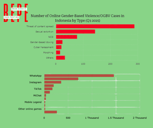 Yang membuat situasi semakin kompleks adalah pergeseran kekerasan seksual ke ruang digital. Di Indonesia, data terbaru menunjukkan bahwa kekerasan berbasis gender online (OGBV) semakin mendominasi. Bentuk paling umum adalah ancaman penyebaran konten pribadi, dengan jumlah hampir 300 kasus dalam satu periode. Disusul oleh pemerasan seksual sekitar 150 kasus dan penyebaran konten intim tanpa izin sekitar 80 kasus. Bentuk lain seperti doxing, cyber harassment, dan manipulasi gambar juga terus terjadi, meskipun dalam jumlah lebih kecil.